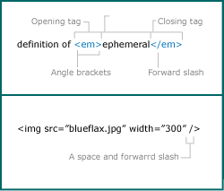Tags-All tags must have a open (<) and close (>) tag to complete it. For example you wouldn't start telling a joke to someone and then just walk off, instead you would finish it with a punch line.